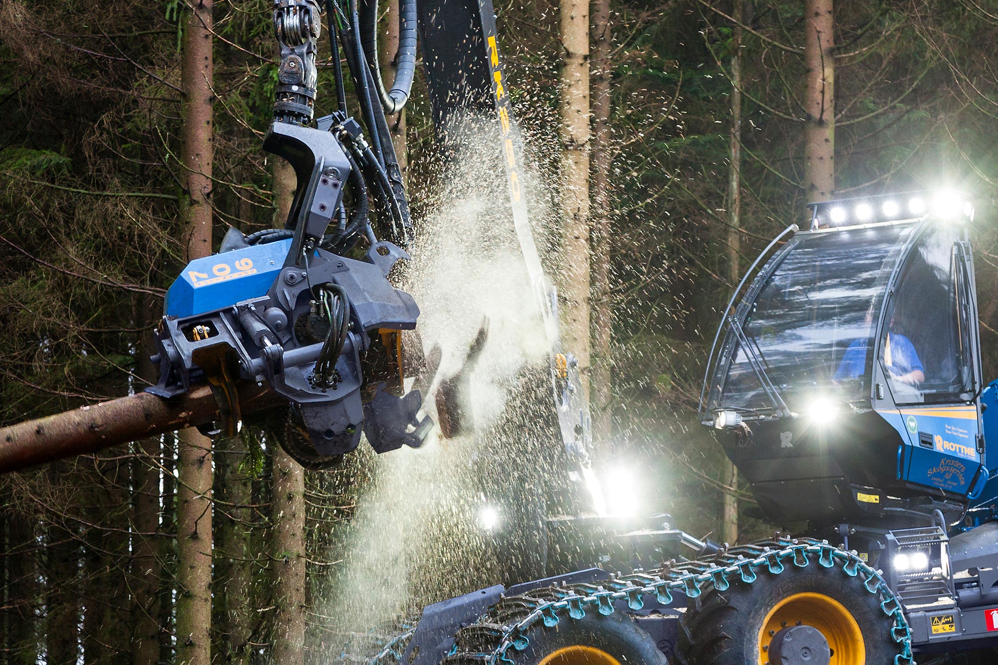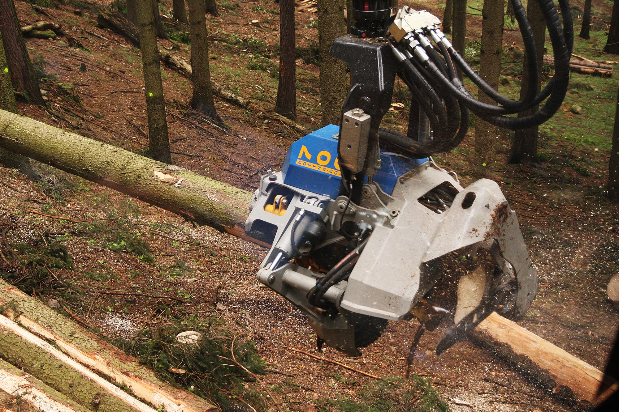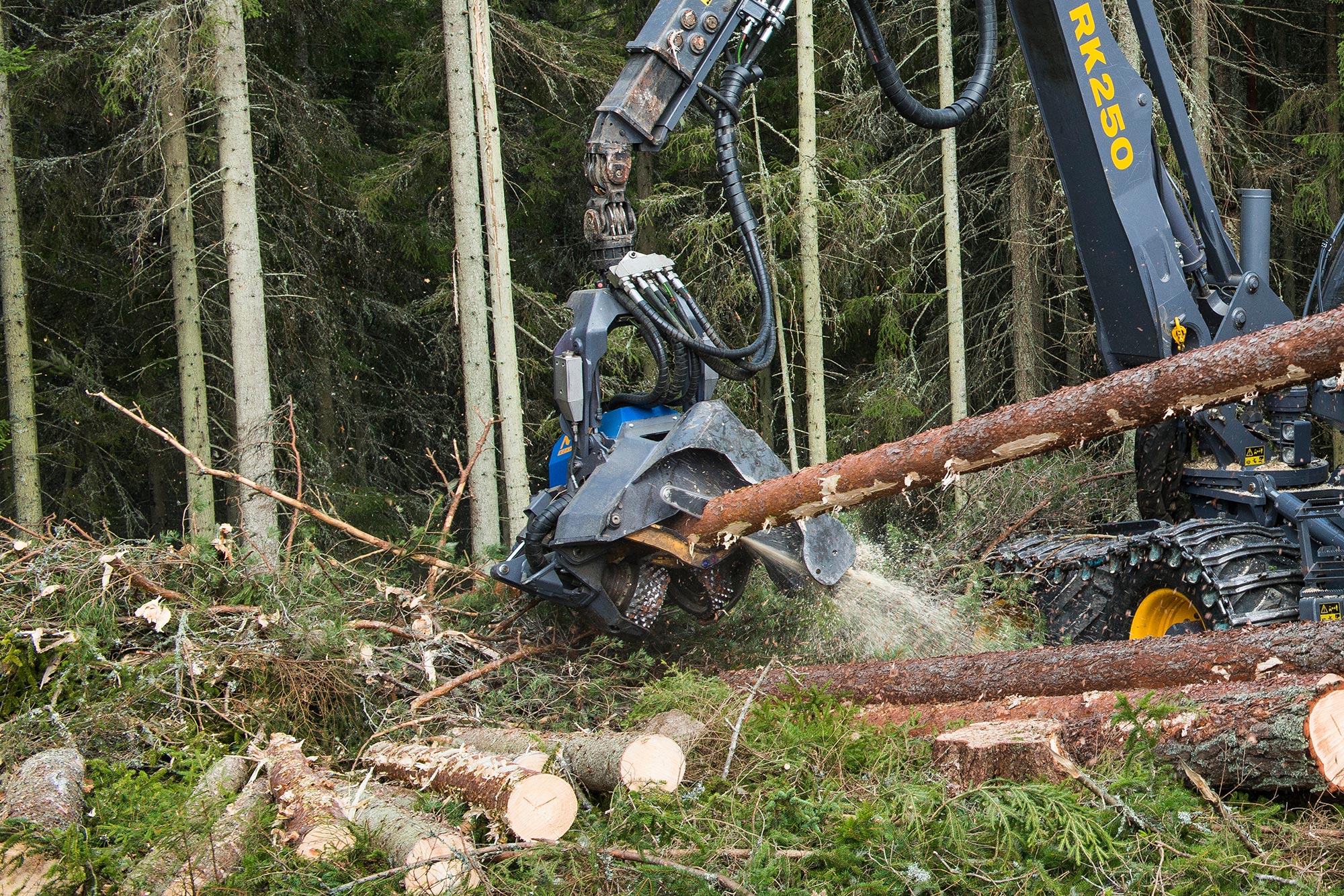 Supporting wheel arms and five feed rollers that provide a steady grip even on the coarsest stems which facilitates the processing of heavy trees. The feed rate is automatically controlled, depending on tree size, which increases production capacity when felling in light stands. Diameter measurement is performed via a sensor in the upper limbing knives and length measurement is performed using a measuring wheel.